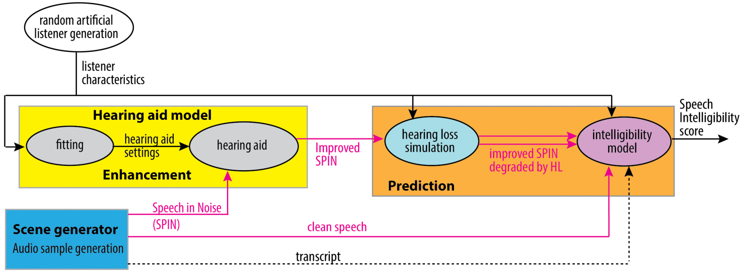 Figure 1 shows a simplified schematic of the baseline system. For simplicity, not all signal paths are shown. A scene generator (blue box) creates the speech in noise (SPIN) that the hearing aid model then enhances (yellow box). This enhancement is individualised for each listener, hence there is also a system to select a random listener (white ellipse) with a particular set of pure tone air-conduction thresholds or audiograms.
