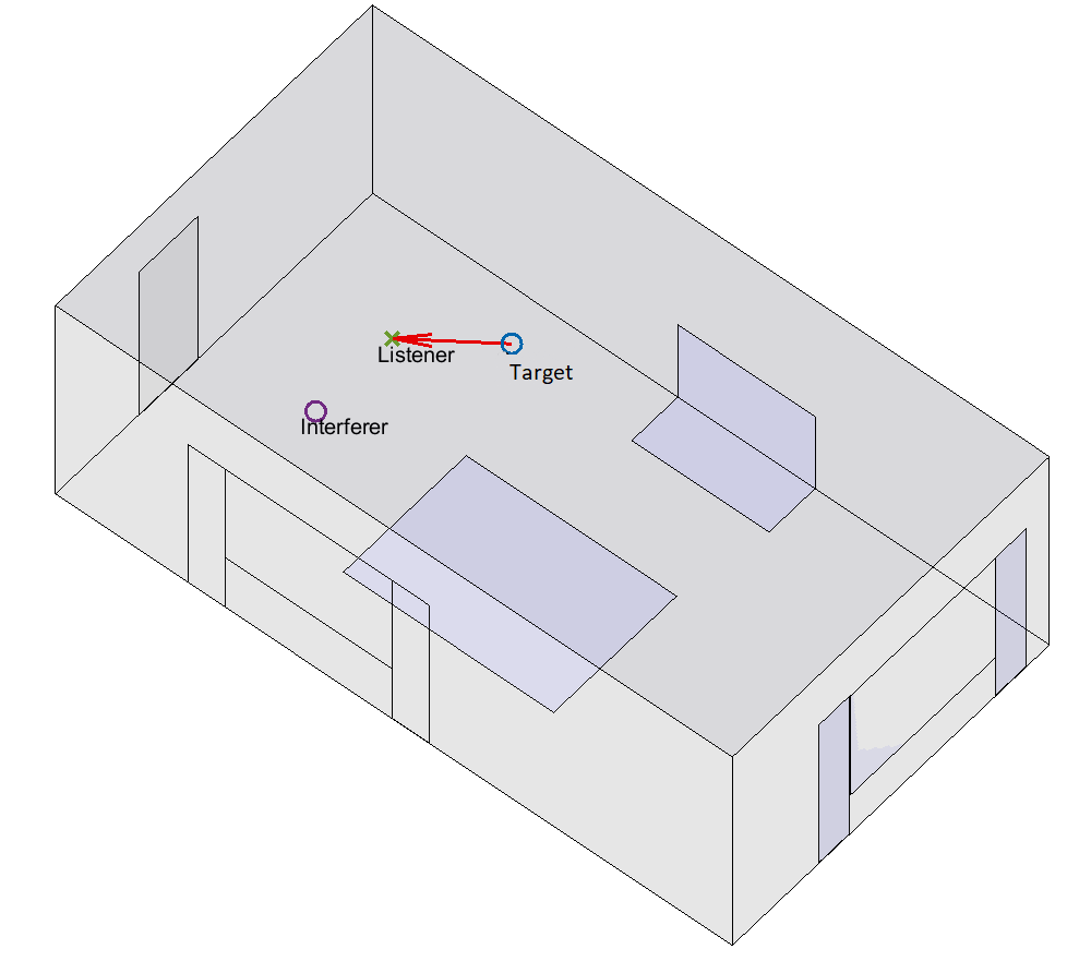The interferer is a single point source radiating speech or non-speech noise omnidirectionally. It is placed within the room using uniform probability distribution random number generators for the coordinates. These constraints ensure the interferer is not too close to the wall or receiver. It is set to be at the same height as the receiver. Note, this means that the interferer can be at any angle relative to the receiver.