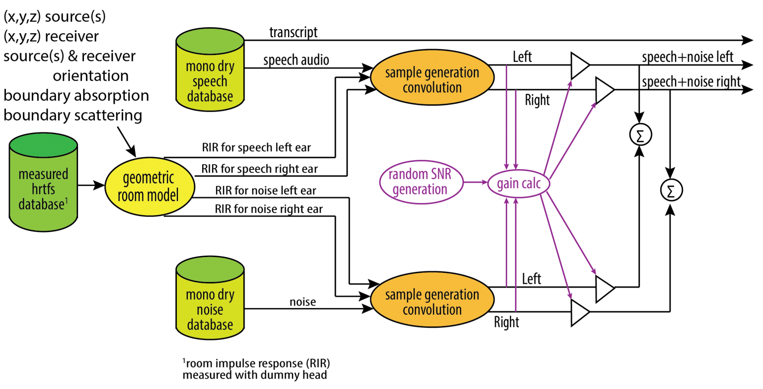 Figure 3. Simplified diagram of the scene generator. RIR refers to Room Impulse Response, HRTFs refers to Head Related Transfer Functions, SNRs are signal-to-noise ratios, and gain calc. indicates gain calculation. Dry here means anechoic. The outputs are noisy speech signals.